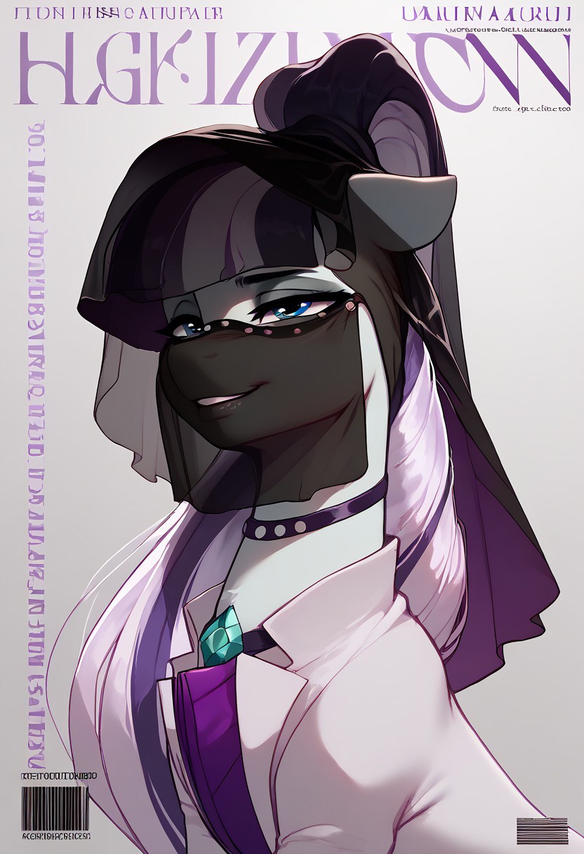 Score_9, score_8_up, score_7_up, best quality, masterpiece, intricate details, OverallDetail, zPDXL, Expressiveh, full body shot, interesting angle, <lora:magazine-cover-ponyxl-lora-nochekaiser:1.5>, magazine cover, fake magazine cover, cover, fake cover, price, cover page, text focus, barcode, content rating, dated, BREAK COUNTESS COLORATURA, Countness Coloratura_\(Mlp\), my little pony, feral pony, petit, cute, hooves, detailed eyes, Moderate opal Eyes,Light orchidish gray with moderate purple streaks,Light aquamarineish gray skin, earth pony, (black head veil:1.8), nightclub stage background, detailed background, microphone stand, standing, clothed female, choker, purple jacked, smug, posing, dynamic pose:1.2, elegant, graceful