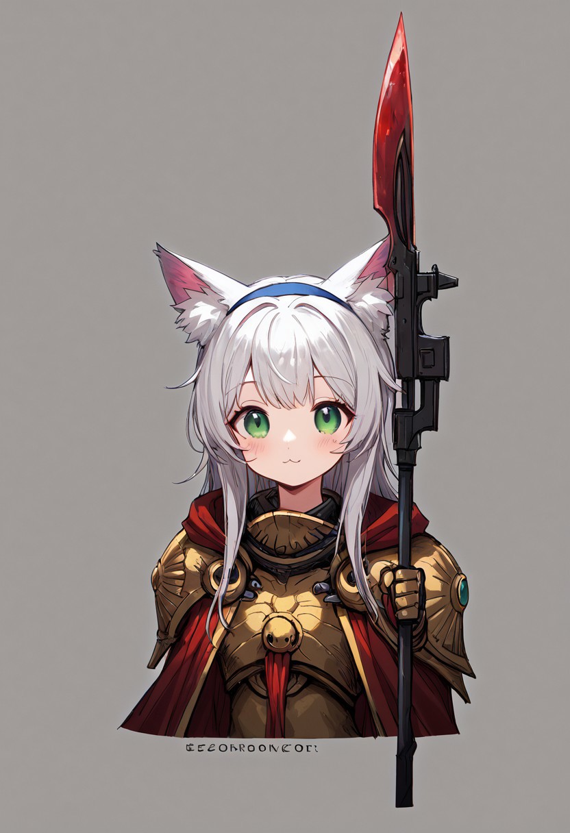 score_9, score_8_up, score_7_up, 1female ,looking at viewer, eye contact, holding weapon, , spear,(((white hair)))),(((cat ears,)))(green eyes),cat tail,((((round cute face))))),blue headband,(((((cute))))) <lora:Zeronis_Style:0.4> zeronis, <lora:Concept Art DarkSide Style LoRA_Pony XL v6:0.7> concept art, realistic, dark theme, low light, arknights rosmontis,long hair,,animal ear fluff,cute girl,round face,((upper body)),((((cute)))),,sealing red wax and attached paper strips , adeptus custodes, golden armor, wh40k, red cape, winged armor, gold armor, black kneehighs,<lora:Adeptus_Custodes_WH40K:1>