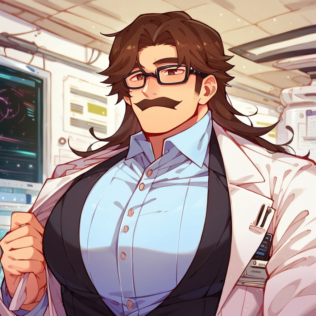 masterpiece, best quality, 1man, long hair, white skin, arm hair, brown eyes, middle-aged man, mustache, glasses, male, brown hair, jacket, BREAK, score_9, score_8_up, score_7_up, score_6_up, highly detailed, perfect anatomy, perfect proportions, lab coat, solo, laboratory, midnight, BREAK chubby man. man in very nice suit, glasses, brown hair, black suit, expensive suit, an14, expressiveh, ,wolfconf