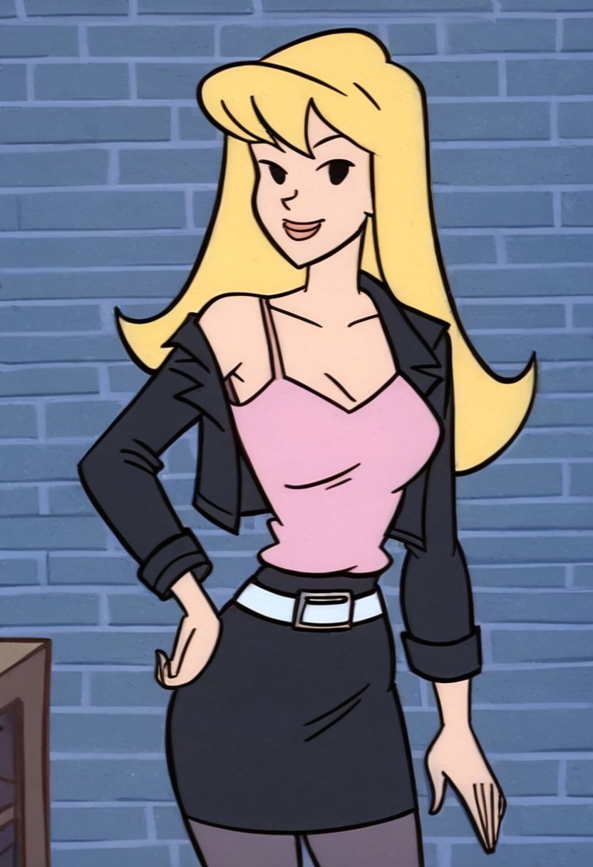 xamberlyx, blonde hair, long hair, indoors, bare shoulders, smile, collarbone, a pink shirt, a black leather jacket, black pencil skirt, white belt, black pantyhose, one hand on hip, posing, blue brick wall, looking at viewer, 1girl, solo,