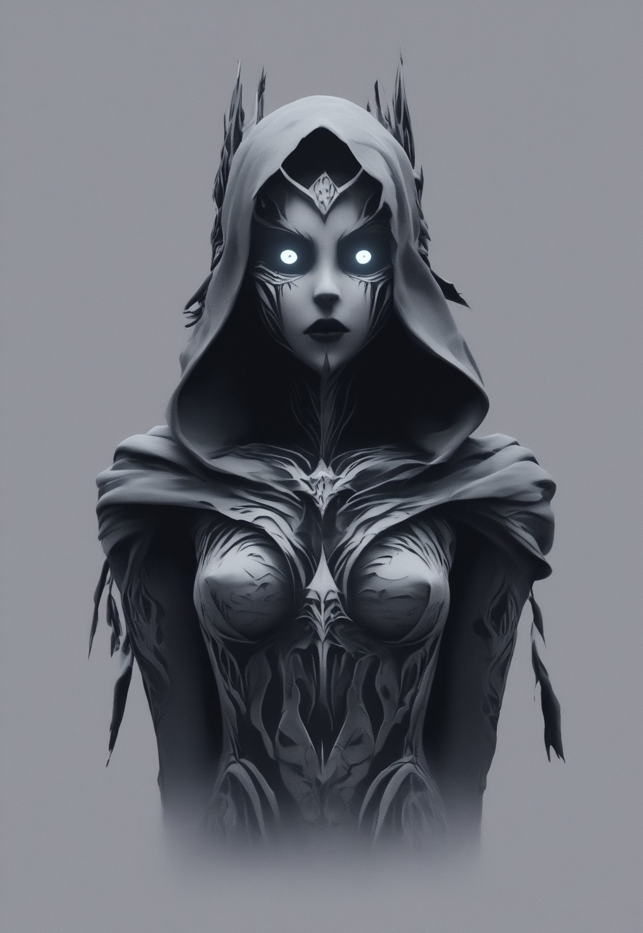 This is a dramatic, CGI-generated image depicting a powerful, mystical scene steeped in void-like darkness. The central figure is an imposing, hooded entity, draped in a tattered cloak that billows eerily around them, as if alive with the essence of shadow itself. Their face remains obscured by the deep shadows of the hood, enhancing the enigmatic and ominous atmosphere. As they stand with arms raised and hands open, a swirling mass of void energy radiates from their fingertips, distorting the surrounding darkness and hinting at their immense control over the chaotic forces of the abyss that swirl around them, pulling in light and matter alike.