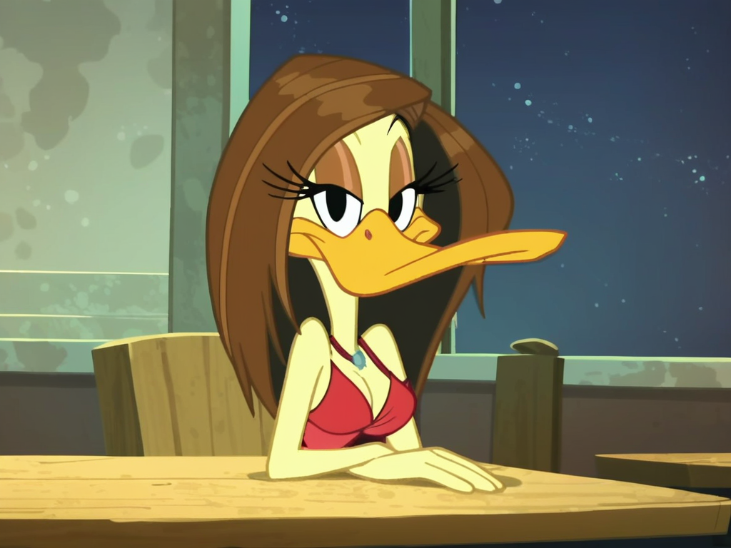 Score_9, score_8_up, score_7_up, score_6_up, BREAK, screencap, indoors, night <lora:Tina_russo_Show:0.8> tina russo, furry female, duck, beak, nostrils, light yellow fur, light brown hair, eyeshadow, black eyes, season one, red dress, cleavage, sitting, looking at viewer, smile, arms on table