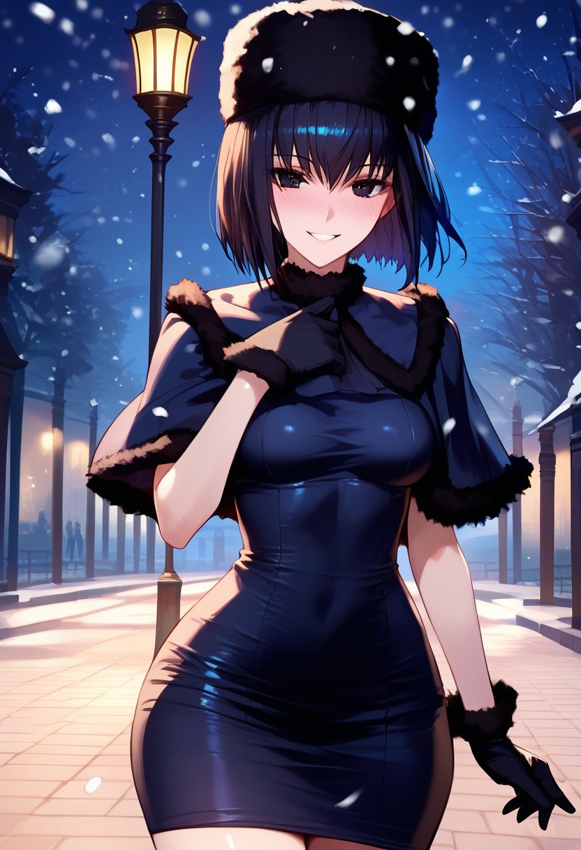 (score_9, score_8_up, score_7_up, high quality, best quality, ultra-detailed, very aesthetic, illustration, perfect composition, intricate details, absurdres, high res image, masterpiece, vibrant colors, beautiful face, detailed face, 1girl, solo focus, single character, perfect eyes, detailed eyes, female), kuonji_alice, black eyes, black hair, short hair, pale skin, thick thighs, medium breasts, wide hips, large ass, (hat, gloves, capelet, fur trim, black gloves, fur hat, dress, black dress), (teasing smile, blush), (outdoors, park, snowing, night, street lamp)