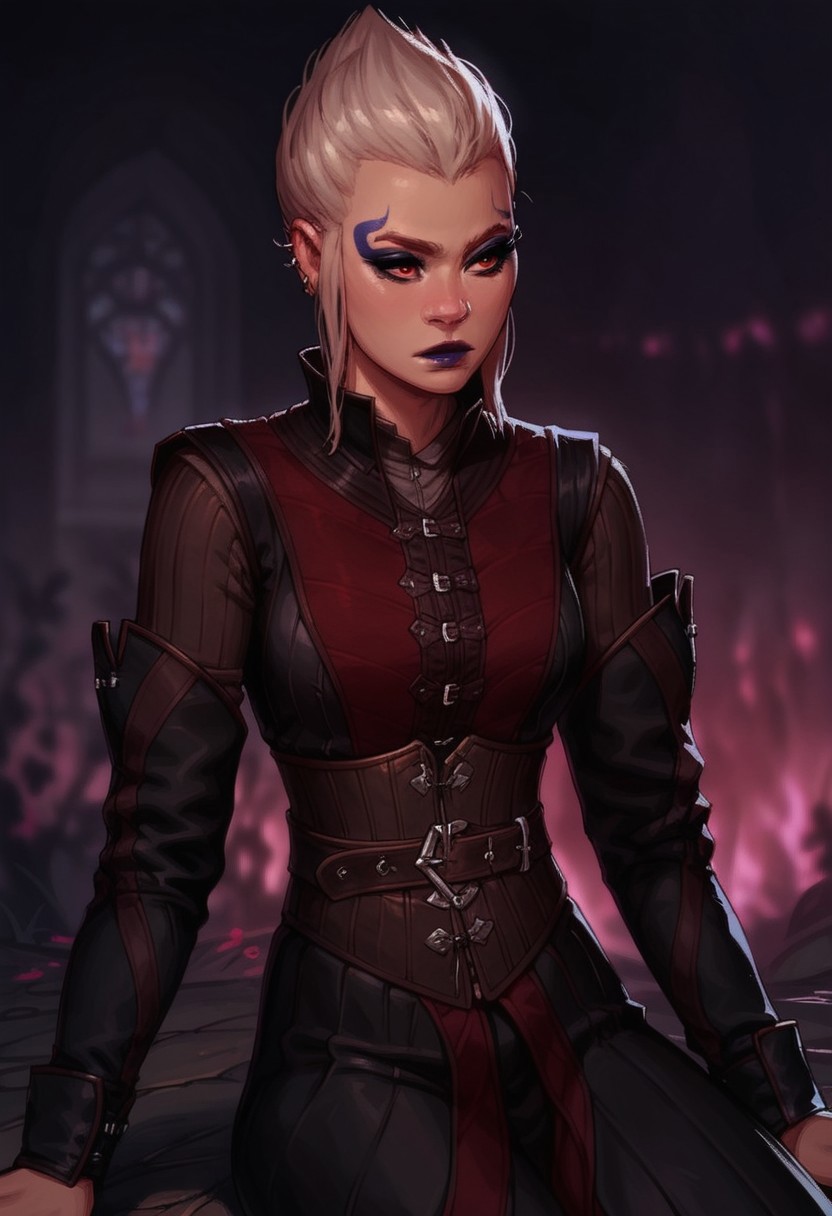 score_9, score_8_up,score_7_up, score_6_up, score_5_up, score_4_up, BREAK, 1girl, bg3fem_warlock, pale skin, blue makeup, blue lipstick, red eyes, white hair, pointed hair, BREAK, dark padded armor, reclining, marble gothic bench, marble gothic architecture, vibrant garden setting, fruit trees, bright daylight, diffused light, soft shadows, ground level shot, BREAK, aesthetic, wallpaper, high quality, concept art, realistic, dark theme, low light, full body shot,