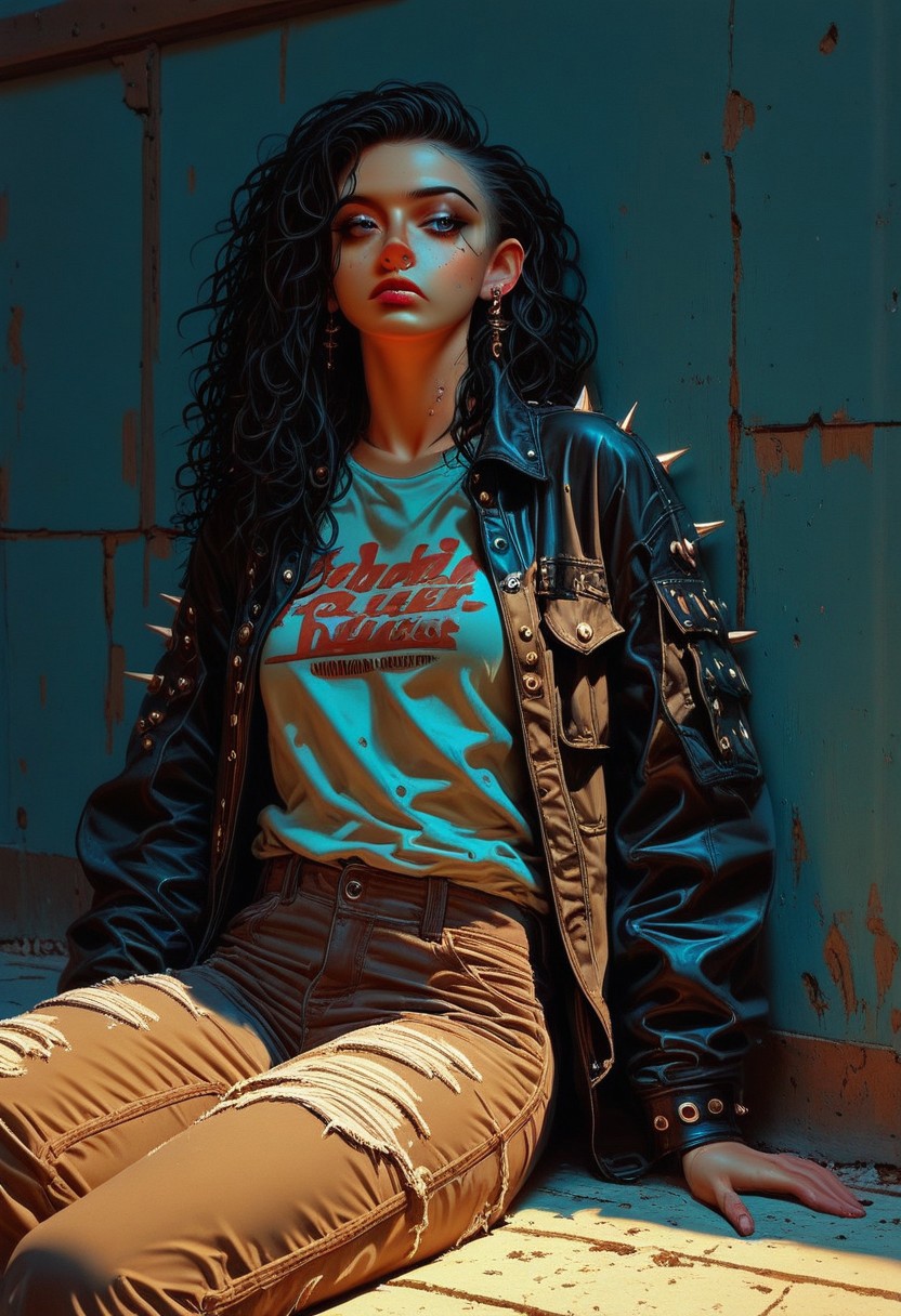 This is a digital drawing in a semi-realistic style, showcasing a young woman sitting on the ground with her back to the wall. The subject has very long black curly wet hair. She has a fair complexion. She wears an oversized leather jacket adorned with metal studs and spikes with multiple pockets and padding on the outside that is torn up. Under that she wears a shirt that is slightly wrinkled, adding to the casual, relaxed vibe of the scene. Tattered brown jeans. She has a nose ring and ear studs. There is trash on the ground. The woman is posed casually, lounging on the bench in a relaxed state without a care in the world. She has multiple piercings and has a punk rock vibe. The background features a chipped paint wall which is painted in a dark blue hue, contrasting with the warm, amber-colored lighting that bathes the scene. The lighting casts dramatic shadows, emphasizing the woman's muscular build and the texture of her t-shirt. The overall mood of the image is contemplative and somewhat melancholic, enhanced by the warm, muted tones and the woman's introspective posture. Ultra-detailed, HD, 8K quality, flawless anatomy, and vibrant contrasts that elevate the composition's opulent allure. The image has high contrast where reflected light appears brighter and shadows appear darker which enhances the contrast and hue which results in a visually stunning image that captures the eye easily. goonstyle