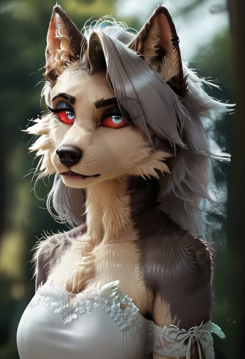 Score_9, loona, helluva_boss, furry, anthro, short hair, grey hair, animal ears, tail, dog girl, wolf girl, animal nose, dog tail, furry female, wolf tail, furry, wolf ears, dog ears, snout, two-tone fur, grey fur, furrification, makeup, fur, fur trim, absurd res, red scelera, sharp focus, <lora:more_details:1.0> detailed background, volumetric lighting, detailed skin, detailed hair, extremely detailed, ultra 8k quality, white iris, high gradient eyes, medium breasts, flat color, dark theme, high definition eyes, fluffynegative, , white snout, Hyperrealistic, photorealistic, realistic, ultrarealistic, high definition, Fluffy, detailed fur, eyesHD, detailed_eye_model, highres, super high resolution, 8k, Wedding dress