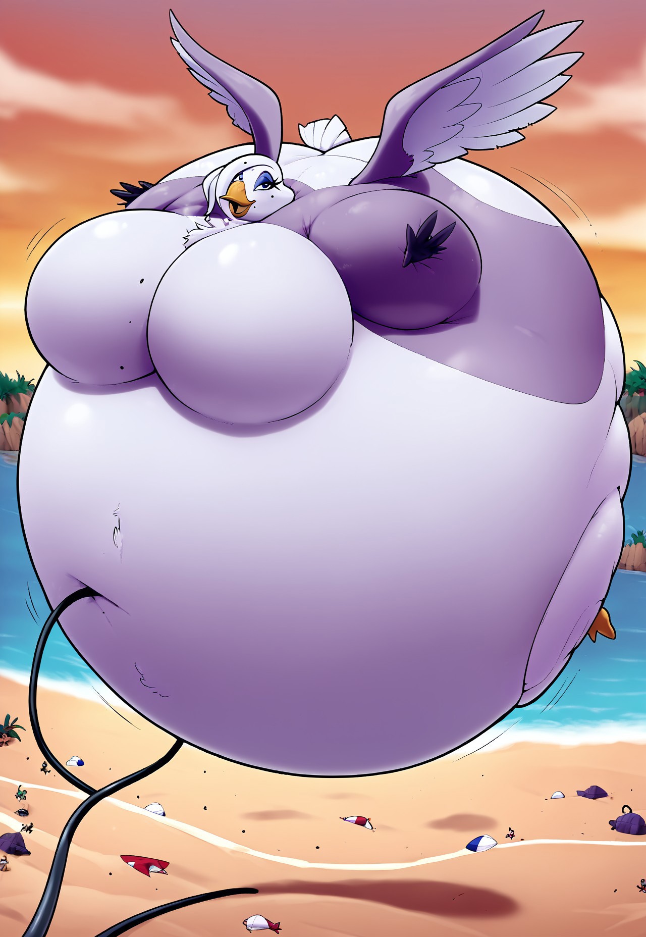 safe_pos, ultra high quality, ultra high resolution, ultra photorealistic, full body, seductive, very realistic,(extremely detailed), detailed feathers, realistic feathers, rough feathers, detailed background,,(high quality, highres, ultra-detailed), sexy, featureless breasts, (8k, masterpiece, best quality, ultra-detailed), (an extremely delicate and beautiful)kawaii, very big eyes, Aesthetic Anime Eyes, small face, huge breasts, High Detail, Sharp focus, dramatic, masterpiece, best quality, ultra-detailed, an image of stella, stellabalto, goose, cartoon, flat colors, white feathers, anthro, huge breasts, feathered body, short beak, yellow beak, tongue, open beak, seductive expression, purple eyeshadow, long eyelashes, blue eyes, white hair, three long white hair strands hanging down, <lora:Stella_Balto_3-000006:0.9> an image of stella, stellabalto, purple feathered wings, winged arms, purple eyeshadow, wide hips, beauty mark, winged arms, floating, flapping wings, orgasm, perfect eyes,(winged arms:1.3),wings, webbed feet, perfect webbed feet, outside, beach, inflating, looking at viewer, lower body, open mouth, (source_furry), holding into hose, spherical inflation, spherical inflation, inward arms, inward legs, sphere body inflation, giant ballooned body inflation, (((blimptall))), (giant sphere body giant rounded circle ball perfect spherical body), puffed legs, puffed arms, floating, looking down towards viewer, clear face, lustful expression, body stuck in area