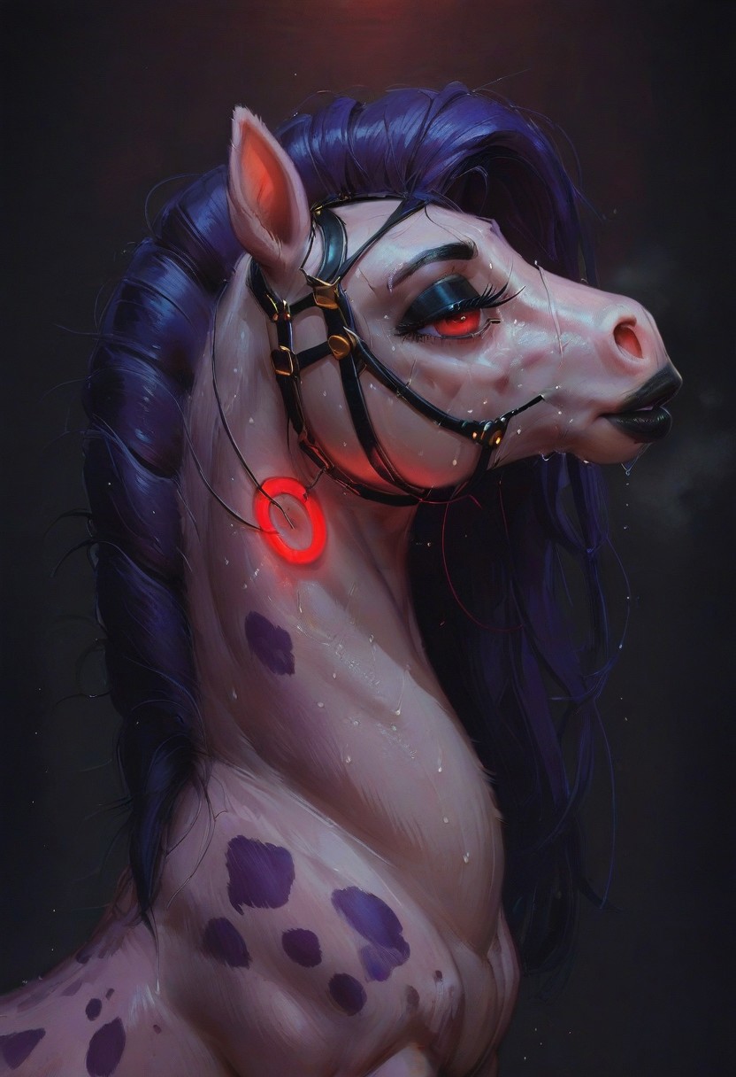 score_9, score_8_up, score_7_up, (((hyper realistic))), modern futuristic theme, empty dark room, sleek floor, feral, Pixelsketcher_style, gold, soft lighting, BREAK, feral, (((light lavender fur))), equine, horse, stallion, (((red dot spots))), attractive, long eyelashes, fluttering lashes, lidded eyes, bedroom eyes, fat rear, oily body, (sweaty body, excessive sweat), seductive, entrancing, BREAK, Thick body, equine body, thick thighs, front portrait view, (((profile pic, circle frame, black background))),(masterpiece), (((long straight mane)), neon purple mane, beige sclera, red eyes, smooth fur, (voluptuous feral body:1.2), (((black eyeshadow, black lips))), (((glowing bright stockings, glowing neon harness))), BREAK, Laying down on side, front