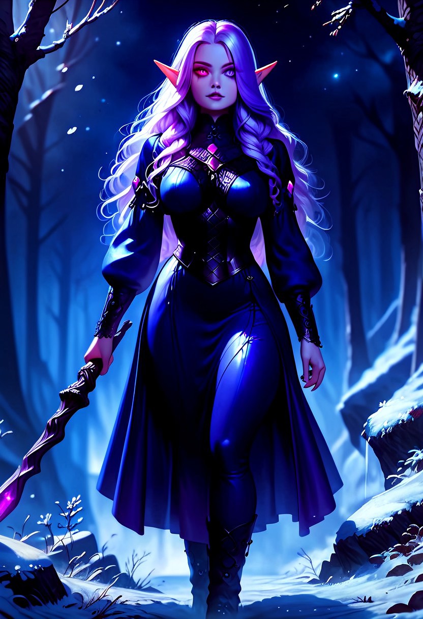 score_9, score_8_up, score_8. score_9, score_8_up, score_7_up, masterpiece, amazing quality, best quality,ultra-detailed,8K,illustration,CG,shiny long pale purple hair, clear skin, ultra-detailed-eyes, heterochromia, heterochromatic red and purple eyes, pale skin, elf ears, gothic girl, Expressive, Dark Beauty, magical research, walking down a hidden path, long hair, half up half down hairstyle, long hair, intricate hairstyle, hair jewelry ornamentation, silver, garnet, amethyst, medieval leather adventuring outfit, teal robes, robe, healer, magic staff, voluptuous, busty, curvy, thick thighs, outdoors, exploring, winter forest view, nighttime, oil painting, d3t41l3d, gorgeous details, cinematic, concept art, realistic, eyesHD, high gradient eyes, detailed eyes, high definition eyes,
