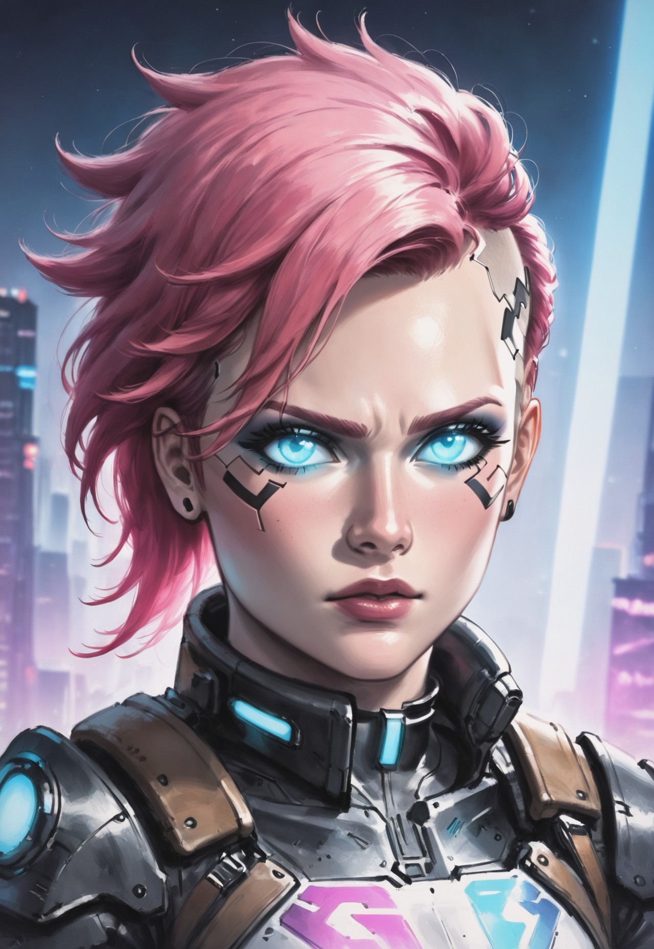 safe_pos, score_9, score_8_up, score_7_up, 1girl, solo, futuristic bounty hunter, advanced tactical armor with glowing neon accents, high-tech plasma pistol with a sleek design and glowing energy core, short spiky pink hair with cybernetic enhancements, realistic, cinematic angle, cinematic lighting, athletic body, determined face, glowing cyan eyes, combat-ready pose BREAK patrolling a neon-lit cybernetic city BREAK source_cyberpunk_art, rating_explicit, expressive, full body, dynamic pose BREAK detailed beautiful background, futuristic cityscape with towering skyscrapers and holographic advertisements, neon-lit streets with floating vehicles, cybernetic creatures and androids, distant neon skylines with flying drones, high-tech atmosphere with a sense of danger and excitement <lora:Expressive_H:0.6>Expressiveh, (SimplepositiveXLv1:1.3), (((upper body, full clothed:1.85))) ((masterpiece)) (ultra realistic, 32k, masterpiece:1.2), (high detailed skin:1.1), (high quality:1.1) (((full clothed))) <lora:DandonFuga_Style_v.2_-_Pony:0.8> (8k uhd:1,4) <lora:add-detail-xl:1> <lora:Dynamic Poses:1>