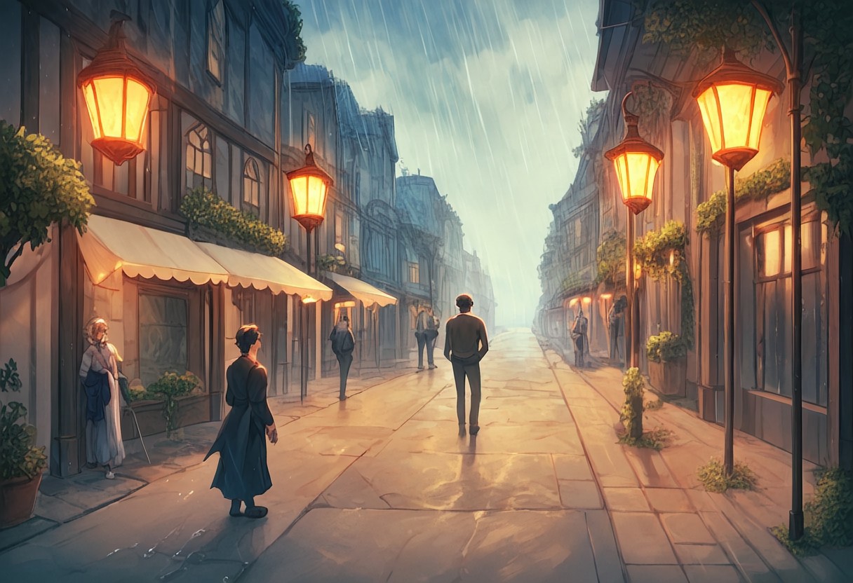 score_9, score_8_up, score_8. score_9, score_8_up, score_7_up, masterpiece, 4k, high quality, (best quality:1.1),anime, beautiful drawing, On a somber, rain-soaked street, a heartbroken man gazes up at the sky, tears mingling with raindrops as he contemplates what lies ahead. The scene comes to life with vivid hues and emotions, capturing the raw vulnerability of the moment. In this evocative painting, the man's disheveled appearance and pained expression are highlighted by the gentle glow of streetlights reflecting off wet pavement. The viewer is drawn into the melancholic atmosphere, feeling the weight of the man's sorrow and uncertainty in the beautifully rendered image.On a somber, rain-soaked street, a heartbroken man gazes up at the sky, tears mingling with raindrops as he contemplates what lies ahead. The scene comes to life with vivid hues and emotions, capturing the raw vulnerability of the moment. In this evocative painting, the man's disheveled appearance and pained expression are highlighted by the gentle glow of streetlights reflecting off wet pavement. The viewer is drawn into the melancholic atmosphere, feeling the weight of the man's sorrow and uncertainty in the beautifully rendered image.