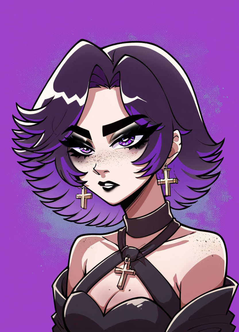 (masterpiece), (best quality), (ultra-detailed), score_9,score_8_up,score_7_up,score_6_up, source_cartoon, afs_ksusha, 1girl, eye contact, black eyeshadow, black eyebrows, black lipstick, black freckles around nose, cross earrings, purple detailed eyes, short spiky hair, bangs, dark purple hair, purple gradient h, illustration, disheveled hair, detailed eyes, perfect composition, moist skin, intricate details, earrings, by wlop, score_9,score_8_up,score_7_up,score_6_up, source_cartoon, afs_ksusha, 1girl, eye contact, black eyeshadow, black eyebrows, black lipstick, black freckles around nose, cross earrings, purple detailed eyes, short spiky hair, bangs, dark purple hair, purple gradient h, full color, determined, beautiful, delicate, intricate, elegant, confident, passionate, vibrant, dramatic, background, illuminated, highly saturated colors, cinematic, extremely aesthetic, lush, enhanced quality, light, very inspirational, innocent, artistic, loving, epic, singular, rich deep vivid colorful coherent fantastic, outstanding, incredible, romantic, wonderful