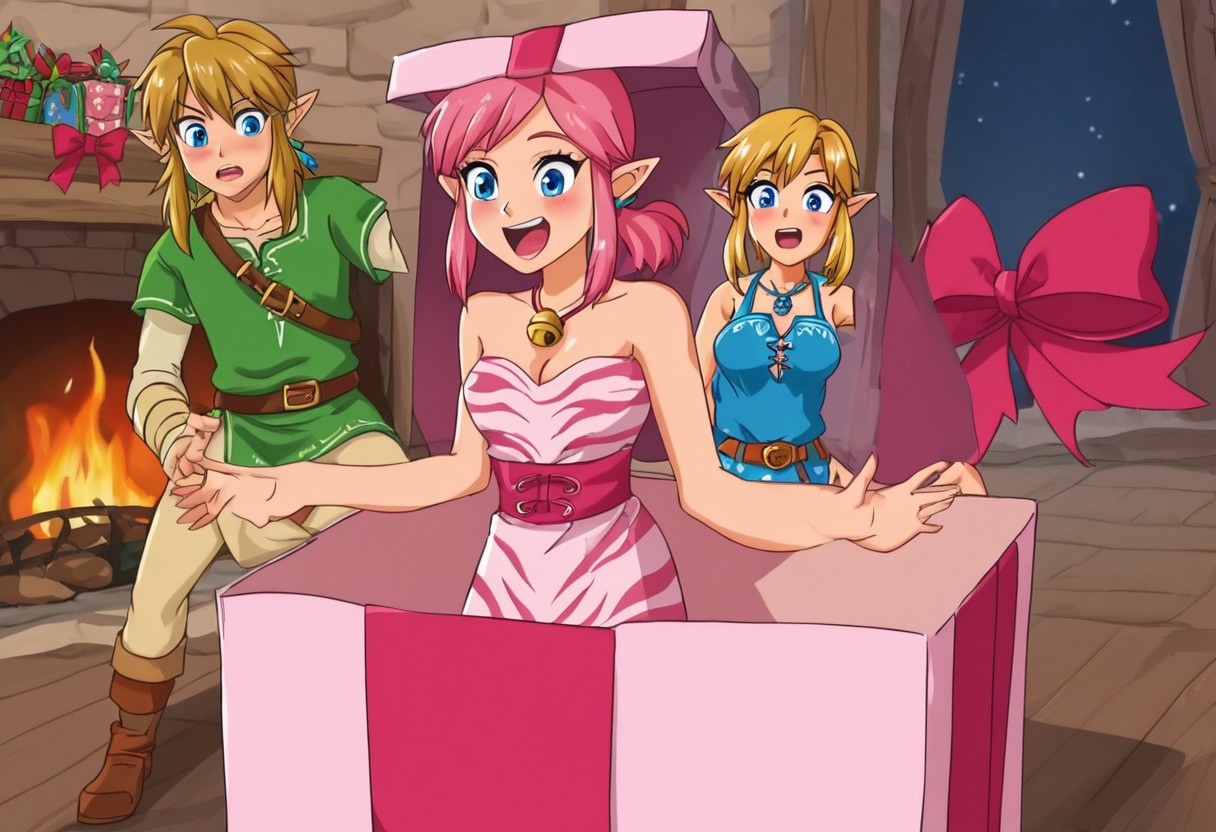 Pink_DragonPink, 1girl, sleeveless dress, white tiger print dress, pelvic curtain, brihht pink hair, cleavage, cat bell necklace, cat ears, white tiger tail, red sash, small breasts, leather shoes, masterpiece, very aesthetic, <lora:pink-illustrious:1>, open mouth smiling, one fang showing Break 1boy,Anime screencap,link (zelda),blonde hair,blue eyes,pointy ears, low ponytail, sidelocks, wearing blue hyilian tunic, surprised Break Inside cozy medieval shack, in front of fireplace, pr3s3nt, gift box, pink in container, waist up, link opening box, link surprised by pink popping up out of it,