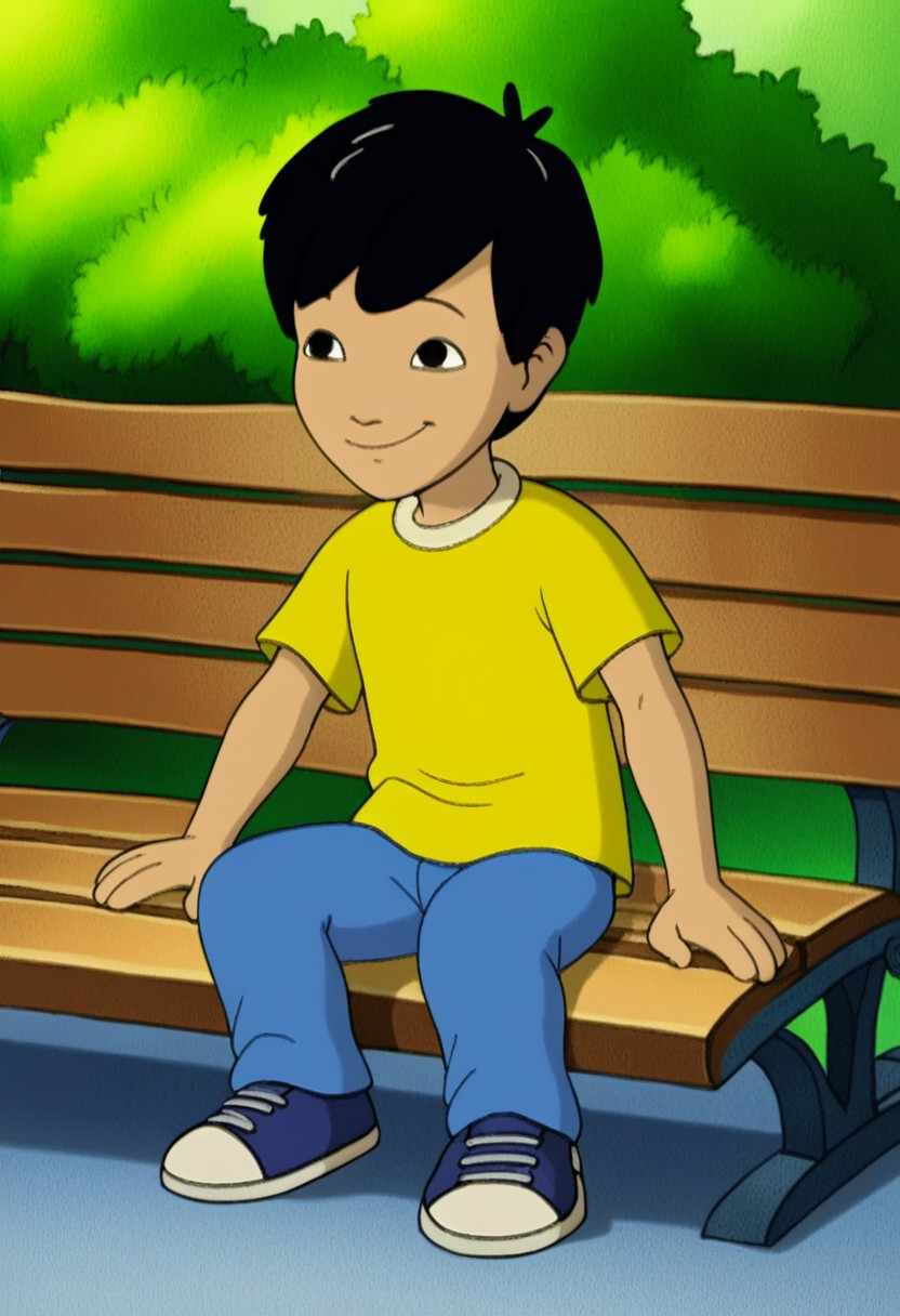 score_9, score_8_up, score_8_up, masterpiece, 1boy, super detailed face, super high resolution, FaceDetail, cute smile, 2D animated, cartoon style, detailed background, complex background, EnriqueDragonTale, 1boy, solo, black hair, Enrique hair, Enrique face shape, yellow t-shirt, blue jeans, dark blue and white shoesEnriqueDragonTale, 1boy, solo, black hair, Enrique hair, Enrique face shape, yellow t-shirt, blue jeans, dark blue and white shoes, park, bench