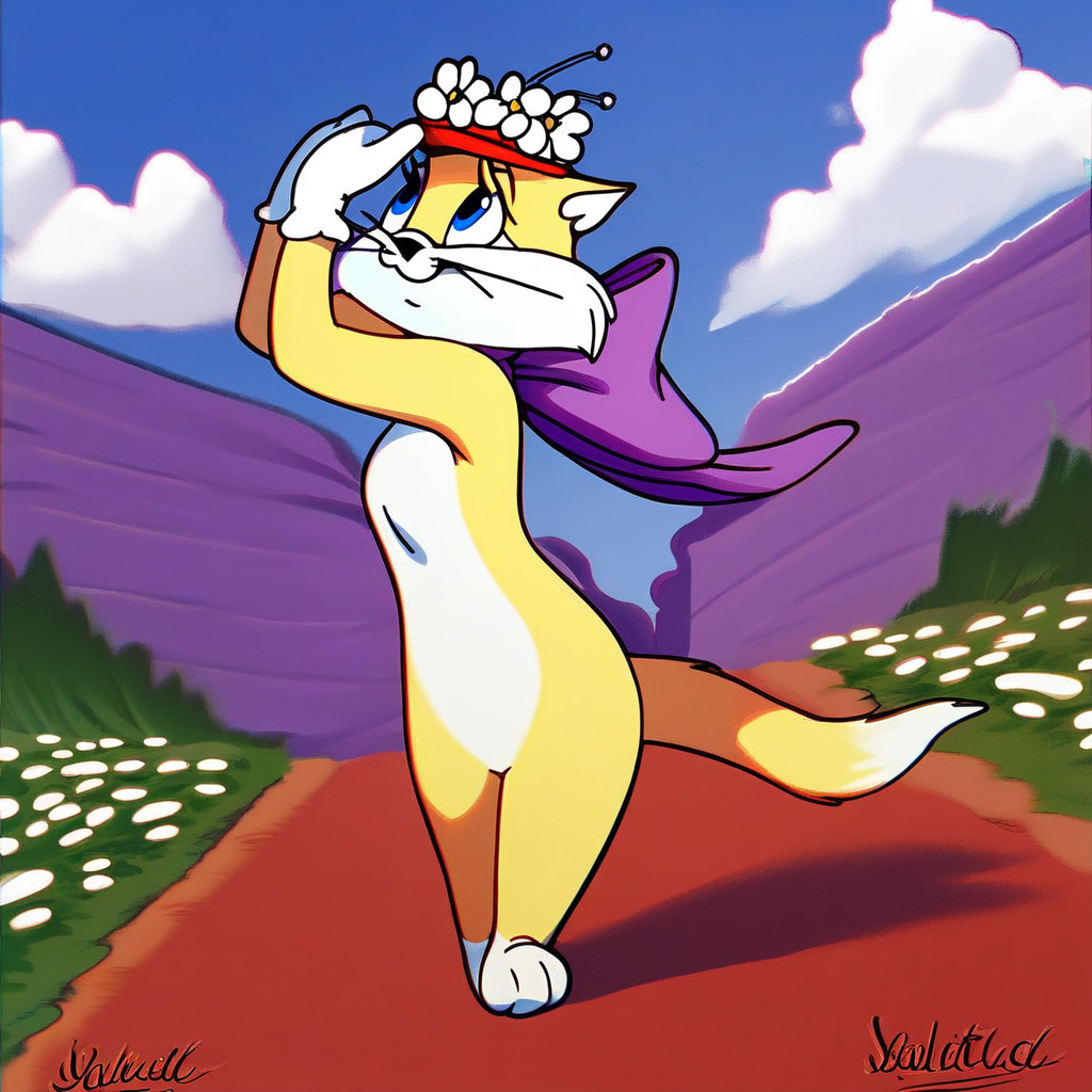 score_9,score_8,score_7,source_furry, sylv14_c4t, sylvia_cat, sylvia_looney_tunes, cat girl, furry female, yellow fur, yellow body, blue eyes, solo, cloud, sky, tail, outdoors, flower, standing, furry, day, two-tone fur, female focus, 1girl, blue sky, hat, full body, walking, hat flower, white gloves, animal ears, white fur, twitter username, cape, gloves, dutch angle, animal nose, two tails, looking up, smile, fanart, alternate style