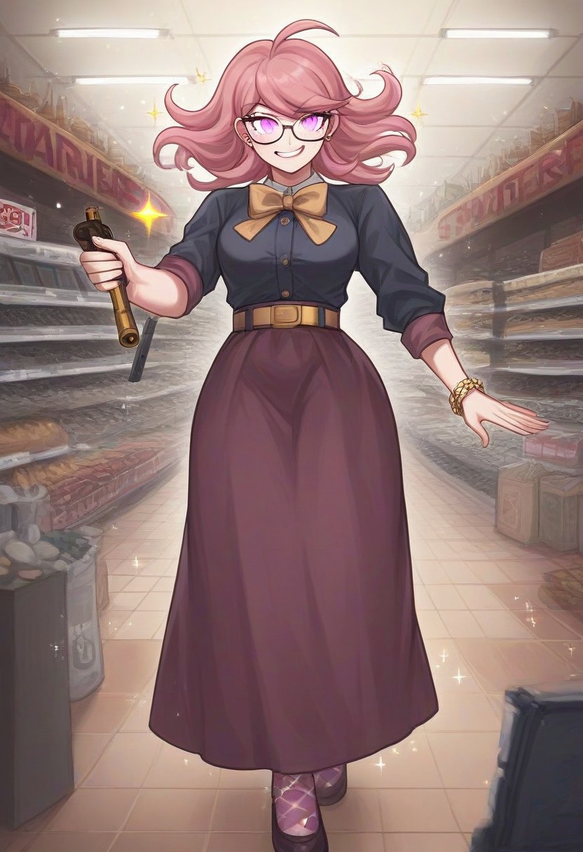 score_9,score_8_up,score_7_up,score_6_up,score_5_up,1girl, score_4_up,CivChan,danganronpa_(series),purple eyes,pink hair,hair_ornament,source_anime,shiny hair,(glowing eyes), medium hair,slit pupils,spiked gold bracelets,pale skin,plump, curvy,frown,smile,crazy,(long tongue),(wide hips),thick thighs,(tattoos:1.4),tribal tattoos,store,market,wooden box,plant pot,(tiles:1.4),rockets,shotguns,(sparkles:1.4),neon lights,(soaked floor sign),supermarket,long skirt,striped stockings,laser gun, gold belt,holding notebook,golden watch,black jacket,white shirt,long sleeves,gold earrings,hand sign,shiny skin,dynamic pose,(bullets:1.6),(floating,flying),flower pot,outdoors,(motion lines:1.4),(thick outlines:1.4),(trembling lines:1.4),sweat,jewelry, steam,(steamy breath),(drunk bubbles:1.4),(gold bowtie),maid, assassin girl,storm_(symbol),(spoken storm),knife,sword,(gun case),bullet belt,weapons,television screens,glasses,computer, masterpiece,best_quality,newest,absurdres,best shadows,light particles,highly detailed background,amazing quality,highly detailed_skin,very_detailed_clothes,power_lines,speed lines, emphasis_lines,very_aesthetic,dynamic_angle,high quality,4k, <lora:add-detail-xl:1.5>