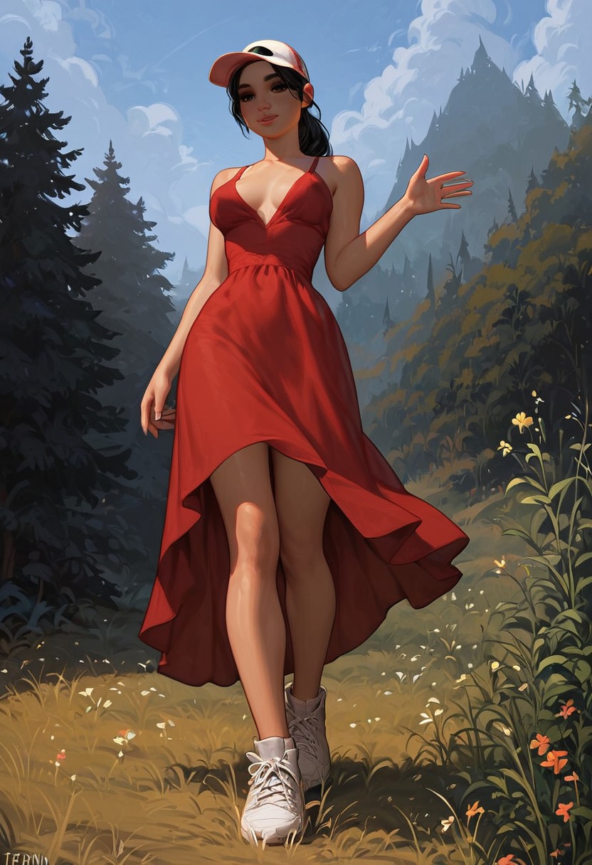 score_9,score_8_up,score_7_up,score_6_up,score_5_up, masterpiece, best_quality, ultra-detailed, masterpiece, (1woman, Far away:1.9), 1girl, rating_explicit, (Expressiveh), 1girl, solo, semi-realistic, same-girl, same-face, 35-yo woman, cute face, (full pouty lips), (black eyeliner), dark brown eyes , smile, flawless shiny skin, black hair, (ponytail), (hair length below shoulders), hair behind ear, hair over shoulder, head tilted, slim fit, (hourglass body), narrow waist:0.5, slender, wide hips, perfect ass, large natural breasts, breasts apart, deflated breasts, white fingernails, nipple outlines, outdoors, house, lawn, shrubs, grass, yard, (sundress, red dress), white sneakers, ((plain red cap, sunglasses on head)), legs, thighs, arms, hands, (waving hand), an opening in the trees reveals the woman far away in the distance, looking at viewer, seductively