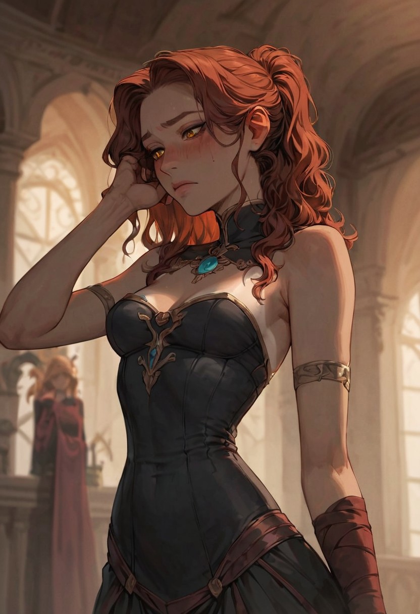 score_9, score_8_up, score_7_up, masterpiece, best quality, Expressiveh, inside, blurred background, dynamic angle, from below, rating_questionable, 1girl, gentle pose, fixing hair, amber eyes, long crimson wavy hair in ponytail, tanlines, small body, narrow waist, small breasts, oiled skin, nervous, heavy blush, eye makeup, elven outfit,