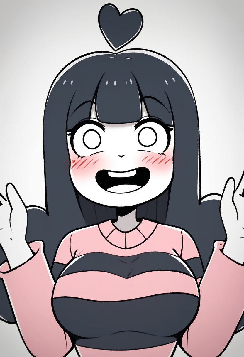 score_9, score_8_up, score_7_up,(masterpiece,best quality)),best res,,good anatomy,cute,(sexy:1.3),ultra cute, (large breast:1.3),face,hot,female,smiling,extremely detailed face,4k,happy, upper body,,detailed eyes,beautiful,smiling,,cute,very cute,, ,blushing,upper body,tall,arms,, solo, blush, perfect lighting, hips, skinny,,,blushing,smiling,tall female,Alex'sCorner, 1girl, long hair, looking at viewer, open mouth, simple background, shirt, black hair, long sleeves, upper body, ahoge, heart, teeth, solo focus, dark skin, blunt bangs, striped clothes, sweater, hands up, colored skin, red shirt, surprised, pink shirt, wide-eyed, striped shirt, scared, white eyes, heart ahoge, smile, multiple girls, brown hair, white background,