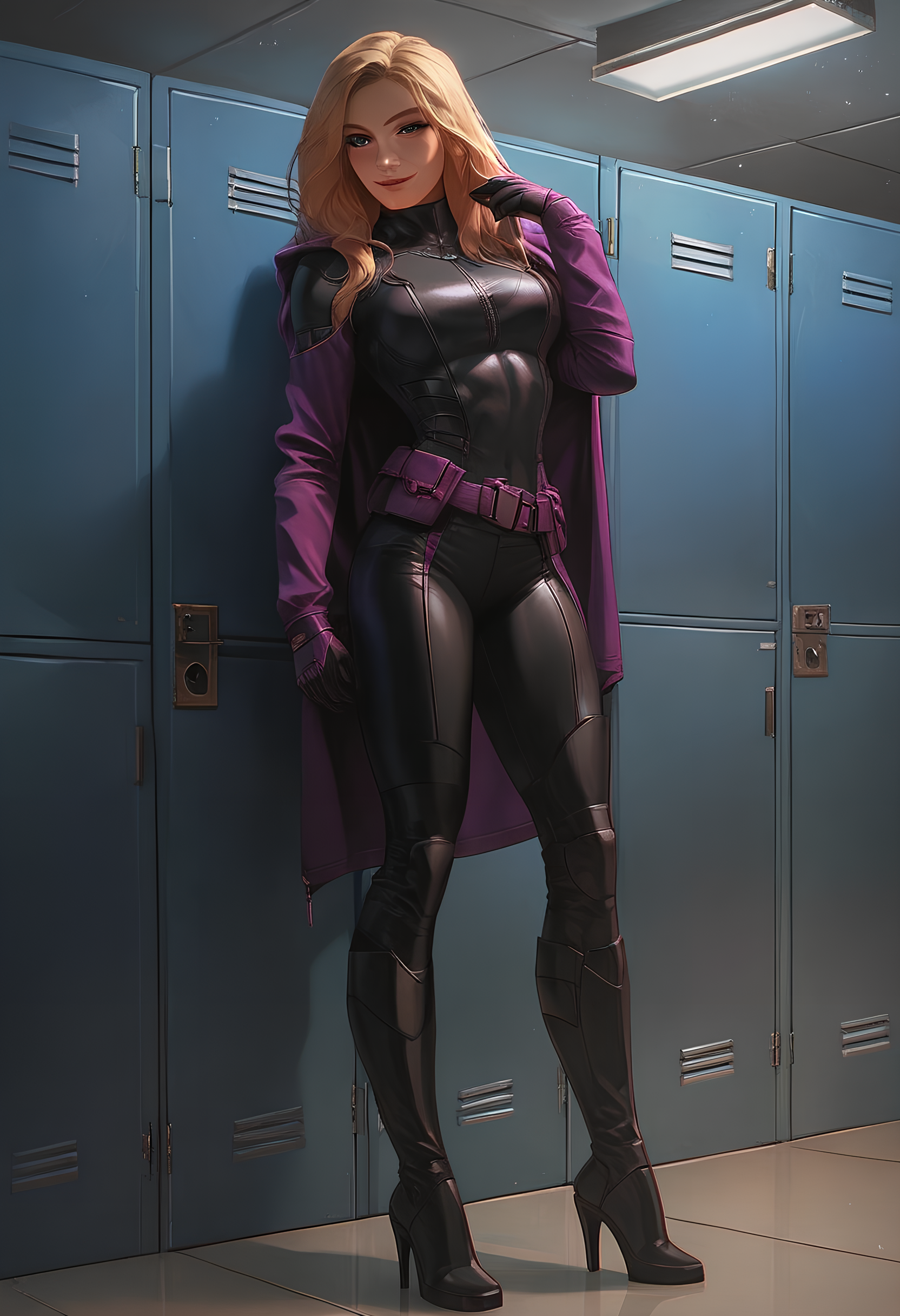 masterpiece,best quality, highly detailed, score_9, score_8_up, score_7_up, score_6_up, score_5_up, score_4_up, Expressiveh, 23yo, 1girl, spoiler, hood down, no mask, long blonde hair, high heel boots, seductive smile, posing, sexy, suggestive, teasing, inviting, changing pose, futuristic locker room, sinfully stylish, dynamic lightning,