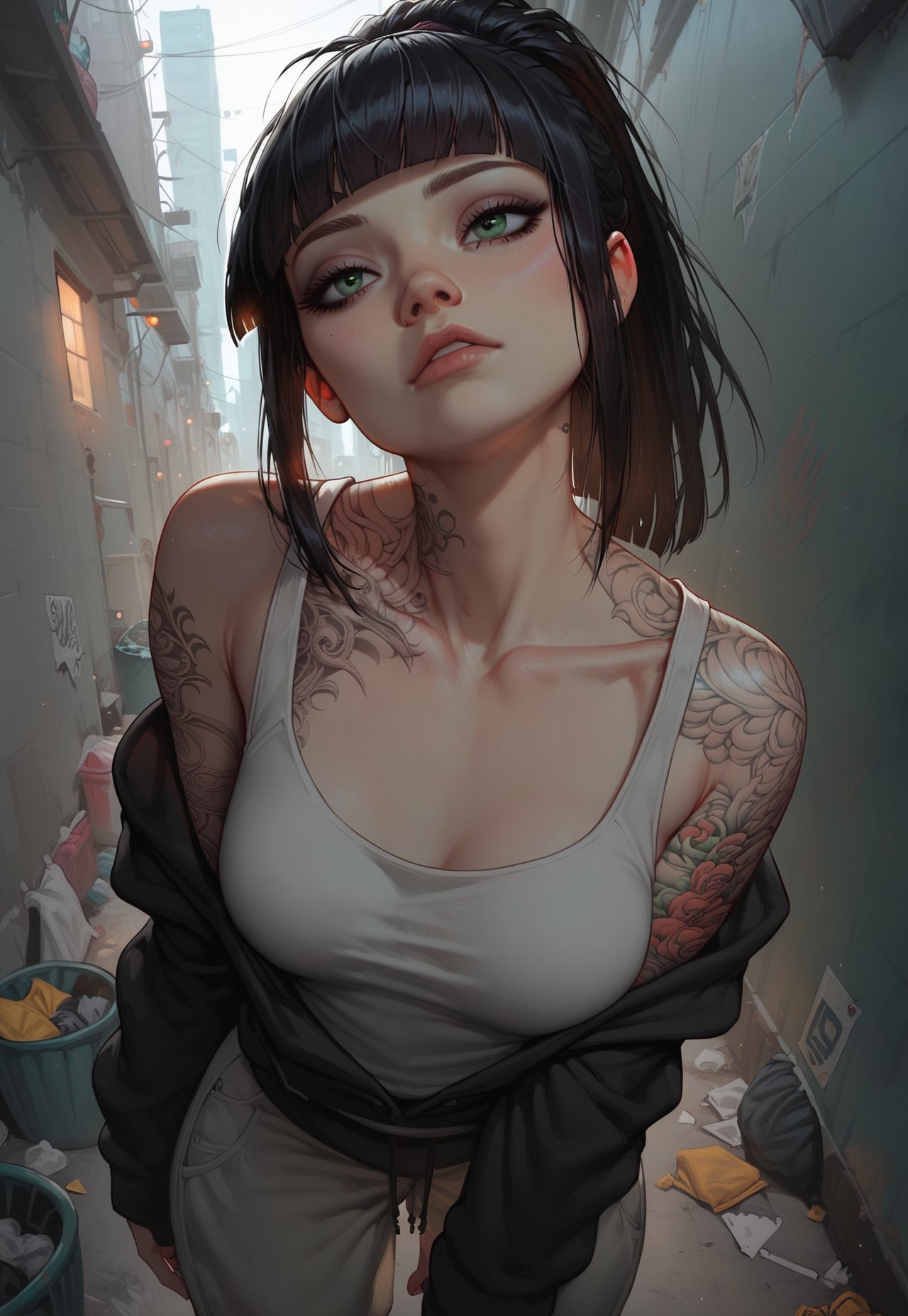 (score_9, score_8_up, score_7_up), 1girl, black hair, (face close-up:1.5), dynamic lighting, green eyes, wide hips, medium breasts, (tall, slender, tattoo:1.2), ponytail, dynamic angle, baggy pants, (hoodie), collarbone, tanktop, shoulders, blunt bangs, city slums, trash, metal grid, evening, standing, dynamic pose, outdoors