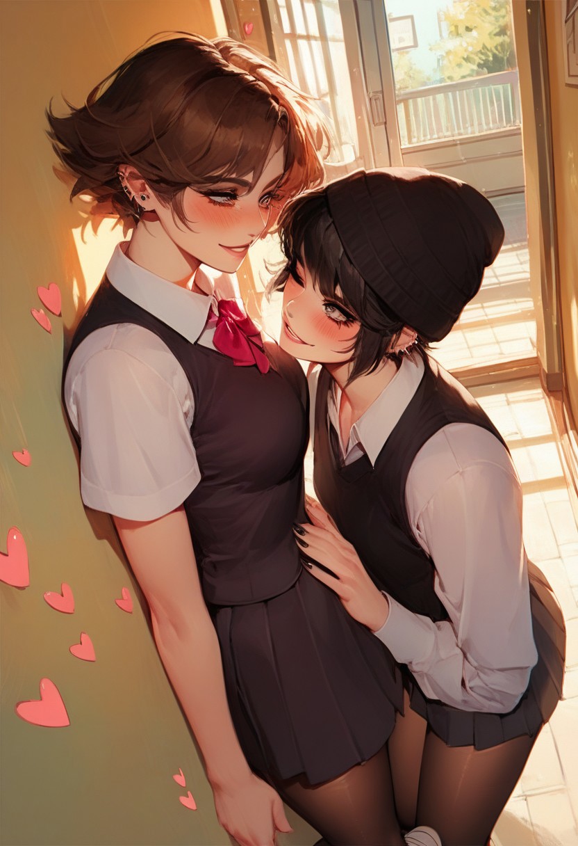 (score_9, score_8_up, score_7_up, score_6_up), dynamic angle, beautiful, source_anime, (anime style:1.1), 2girls, in school, school uniform, cute girls, sunlight, different hair styles, looking at each other, nail polish, leaning on wall BREAK (First Girl, (normal girl:1.2, (Long Carly hair, brown hair:1.2), with bangs, breasts, rounded breast, miniskirt and shirt (collared shirt) and vest, smirk, blushing, pantyhose, sneakers) BREAK (Another second girl, emo girl, one eye closed, love, hearts, (short hair, black hair:1.1), (beanie and hood jacket:0.8))