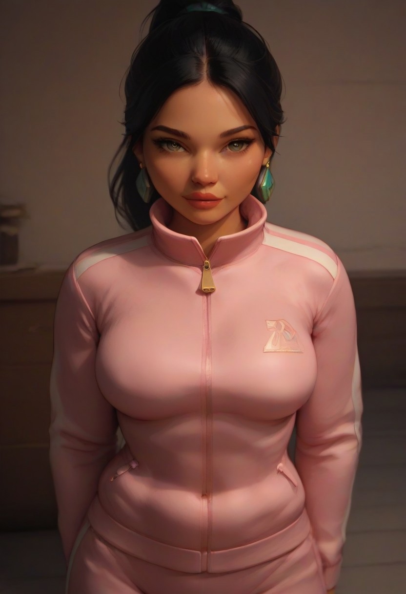 (score_9, score_8_up, score_7_up), score_6_up, best quality, masterpiece, extreme detail, perfect lighting, 4k, 2d, rating_explicit, nsfw, very detailed, best quality, highly detailed texture, depth of field, masterpiece, BREAK, 1girl, ChelXLP, chel, black hair, majestic,beautiful bright pupils, black hair, ((ponytail)),green earrings, cute face, (gorgeous face:1.3), (skin detail:1.3), (shadows:1.3), (oily, shiny:1.3), long hair, large breasts,perfect body, ((( outif3, jacket, pink jacket, pants, track suit, ))), front view, looking at viewer,interior shot, expensive, detailed, intricate details, camera, fantasy, solo focus,epic, concept art, realistic, highly detailed, realistic,((( cowboy shot))), tan skin,Sculpted grace
