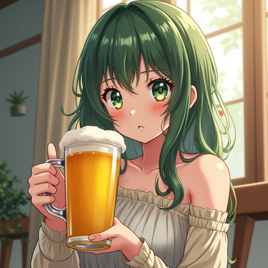 anime girl score_9, score_8_up, score_7_up, masterpiece, best quality, amazing quality, very aesthetic, high resolution, ultra-detailed, absurdres, newest, high res, ultra-detailed, extremely high quality, photorealistic, beer glass full to the brim, cucumber