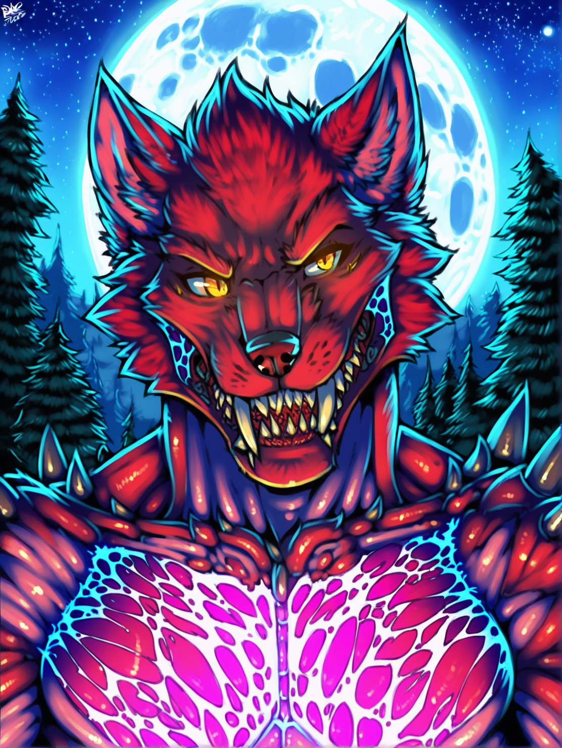 score_9, score_8_up, score_7_up, high quality, best quality, detailed, intricate details, hdr, uhd, 4k, masterpiece, outdoors, night, forest, moon, artwork, <lora:BladeDrakePonyv1:1> bladedrakeponyv1, solo, anthro wolf, furry, spikes, red fur, 1boy, teeth, sharp teeth, glowing pattern, yellow eyes, monster, <lora:Strype_Style_PonyXL:1>,
