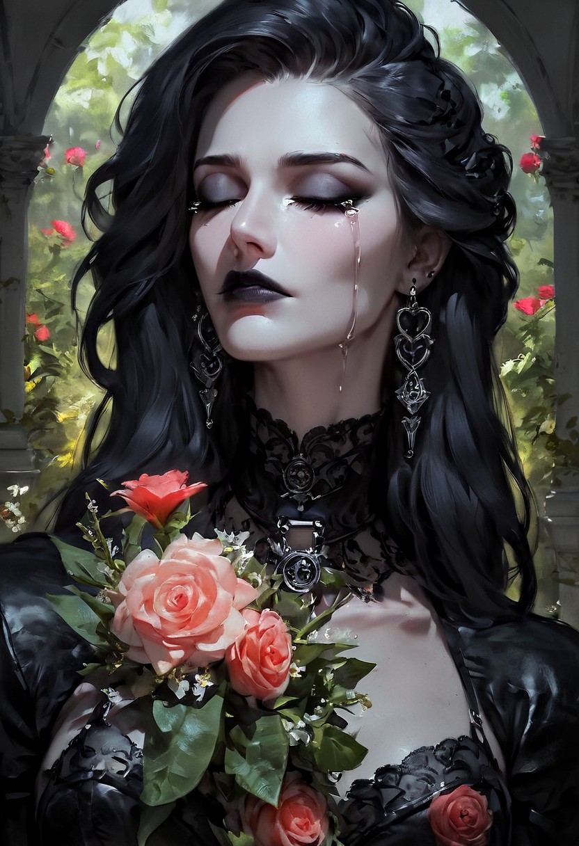 score_9, score_8up, score_7up, a beautiful sleeping goddess of life, crying golden tears, surrounded by a garden of rot, vibrant, colorful, Your love is a rot-softened kiss, A bouquet of blight that you call bliss, You weave me a gown from the mold, Whispering decay feels like gold, Is this my calling?, Or am I falling?, Between two loves, so enthralling, Bound to bloom in gardens grey, Where love and rot both have their way, Bound to bloom, no path is clear, Does love confine or persevere?, glossy reflections, sleek metallic texture, and luminous sheen, gothic art, oil painting, traditional media, realistic, g4n1m3, Goth girl, concept art, realistic, dark theme, low light,