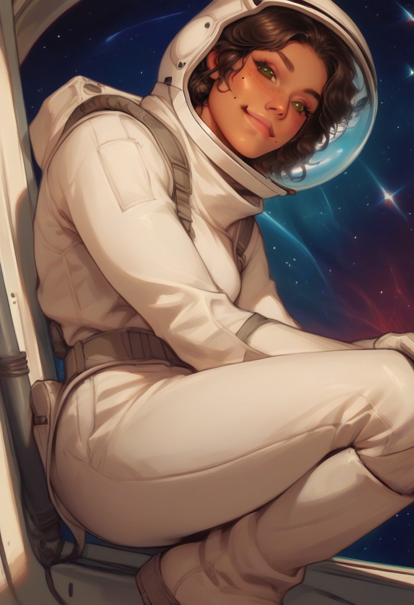 score_9, score_8_up, score_7_up, score_6_up, solo, detailed background, Semi-realism, PRSNL4 Style, very aesthetic, digital drawing, g0th1c, painterly, brushstrokes, detailed, dynamic angle, girl, dark skin, tanned, brown hair, fluffy curls, green eyes, freckles, moles, beauty mark, smile, astronaut, helmet, space helmet, astronaut helmet, looking at viewer, beautiful, white boots, gloves, BREAK alien planet, alien environment, detailed background, warm colors, detailed shading, masterpiece, high quality, insane details, from below, retro, side view