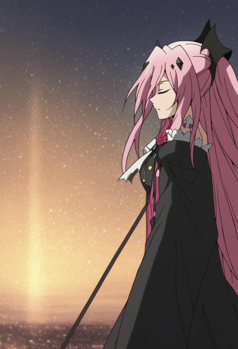 Masterpiece, best quality, clear quality, dynamic lights, cinematic lights, offical art, source_anime, seraph no end style art <Lora:krul-tepes-anime Swallowtail_Illustrious_v53> Solo, krul tepes, pink hair, eyes close, charging a slash sword, princess of vampires clothes, dark dress, Raise one arm poes holding a giant blade, side view angle, eyes close, Great queen, brave warrior queen, Destroyed city background